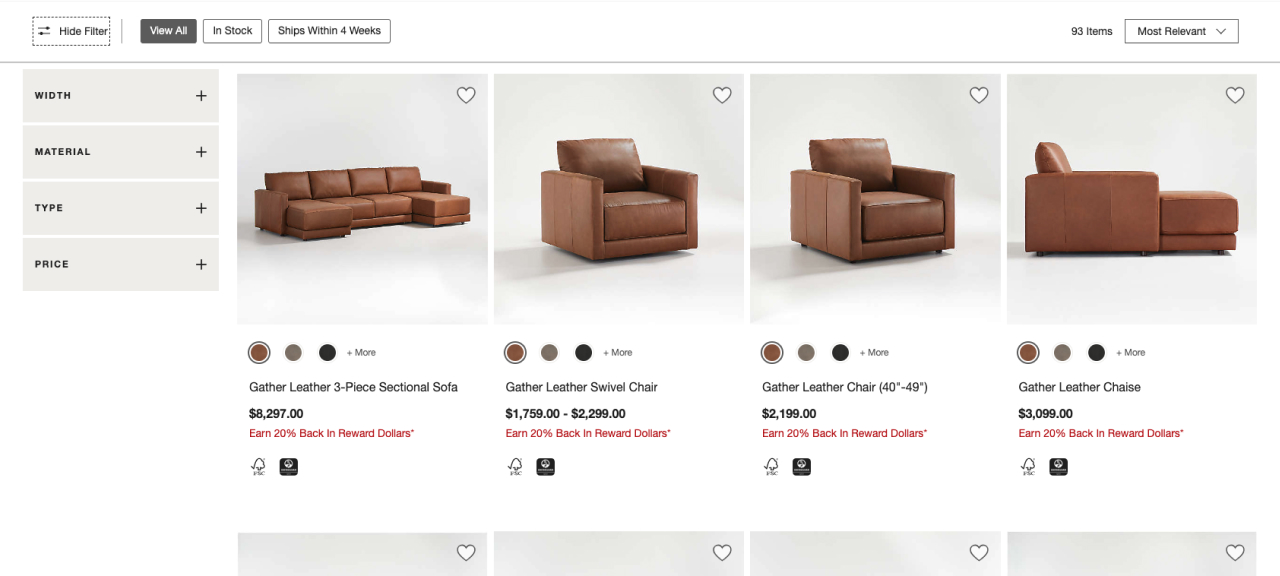 Проучванията показват, че оптималният брой продукти, които трябва да се показват в един списък, зависи от типа на продукта и устройството, което потребителят използва. За продукти, базирани на спецификации, като електроника, 50-100 артикула са оптимални за десктоп версията. За продукти, базирани на визуални критерии, като дрехи, бройка от 100-150 на страница e най-оптимално според проучването. На мобилни устройства, оптималният диапазон е между 15-30 продукта.